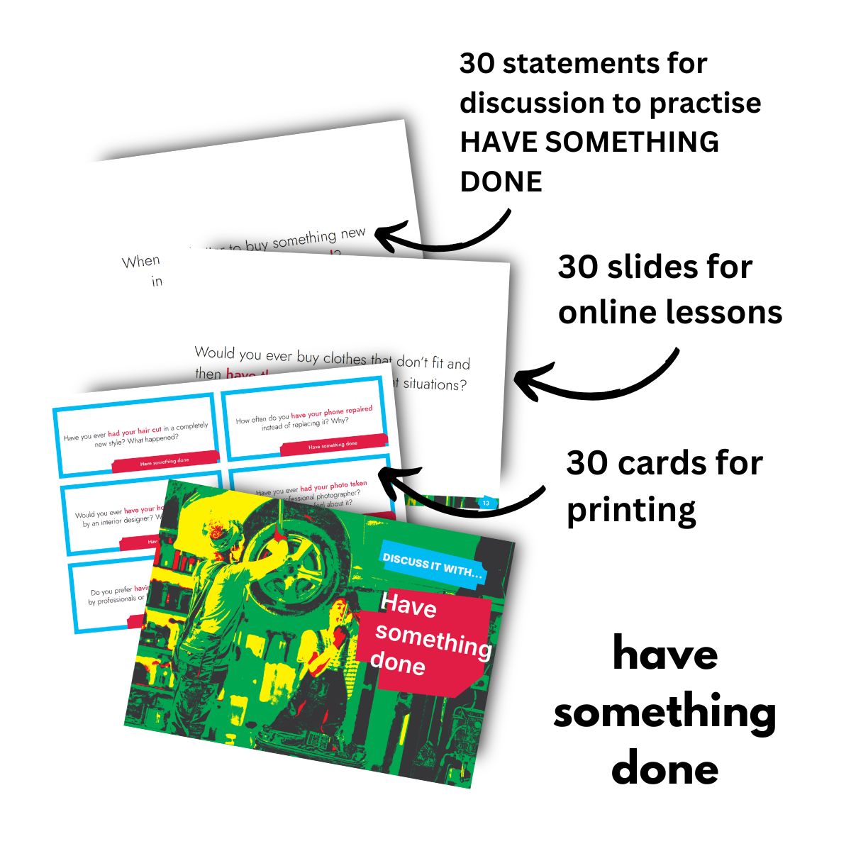 Discuss it with - have something done is a set of 30 questions for discussion designed to help students practise the structure have something done, building accuracy and fluency at the same time.