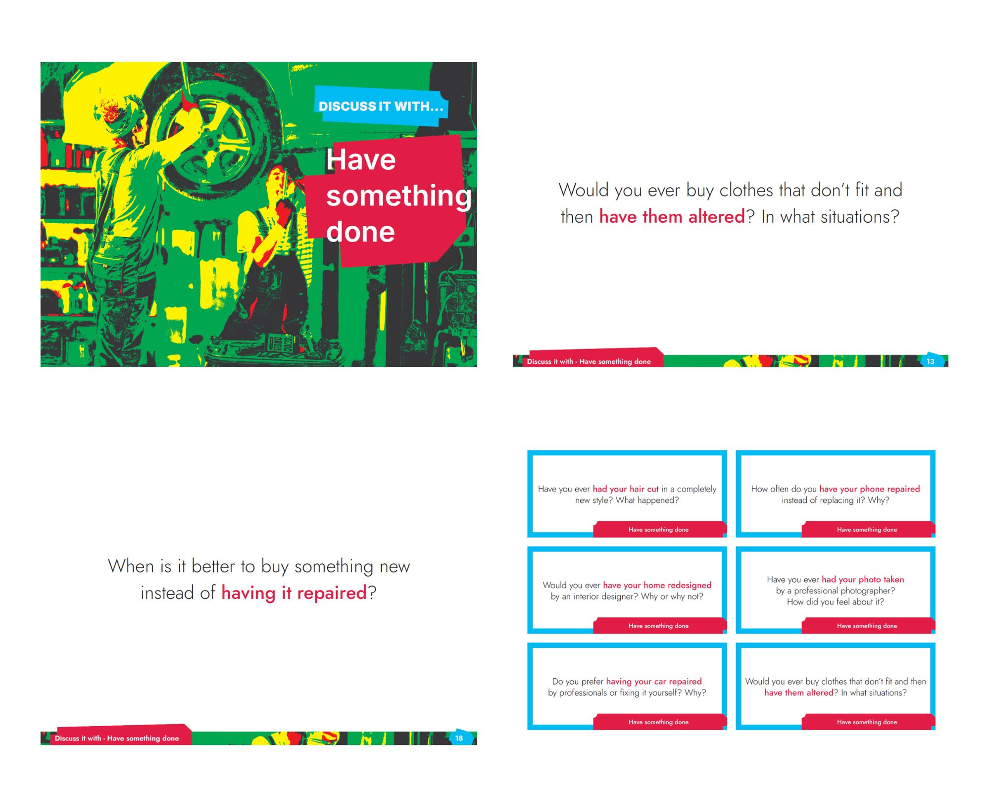 This set includes 30 questions for discussion about everyday topics. Each question includes the structure have something done, which is highlighted so that students remain aware of the grammatical focus while speaking.