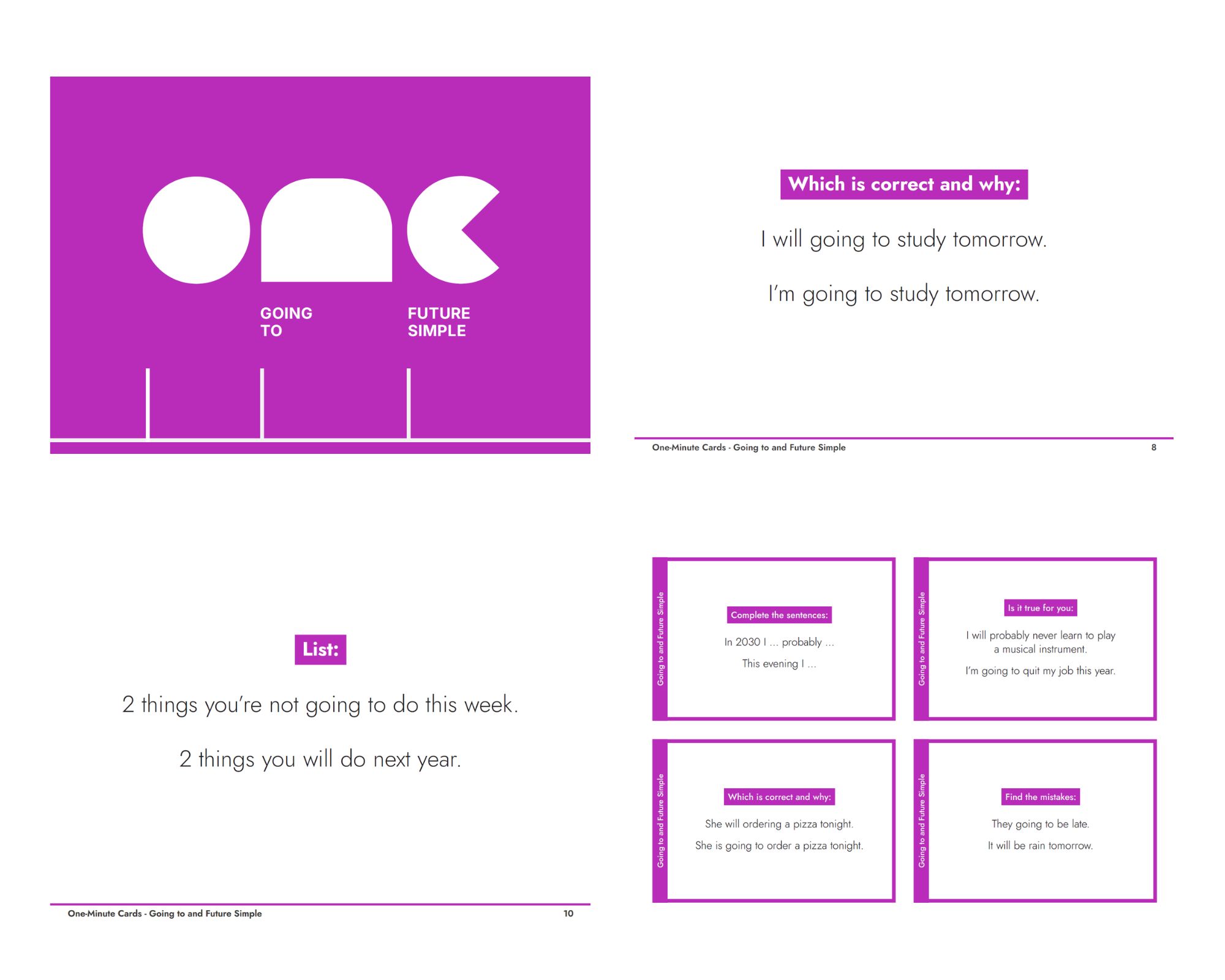 One-Minute Cards: Going to & Future Simple is a set of 30 cards for quick and varied practice and revisions of Going to and Future Simple.